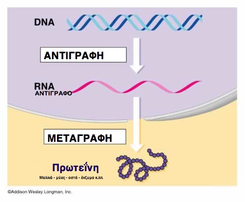 Το DNA αποτελείται από γονίδια και το κάθε γονίδιο περιέχει την πληροφορία για μια συγκεκριμένη πρωτεΐνη που μέσα από μια διαδικασία αντιγραφής και μετάφρασης (μεταγραφής) της πληροφορίας φτιάχνονται οι πρωτεΐνες που δομούν τα οστά, τα μαλλιά, τους μύες, τα ένζυμα κ.λπ. (βλ. εικόνα)