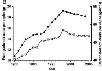 Η αύξηση της κατανάλωσης νατρίου αυξάνει άμεσα το αίσθημα της δίψας και την κατανάλωση υγρών. Ο σύγχρονος όμως άνθρωπος όταν διψάει δεν πίνει απλά νερό. Συχνά τρώει περισσότερο, και τα υγρά που πίνει είναι αναψυκτικά, χυμοί και αλκοόλ. Η κατανάλωση αναψυκτικών είναι ανάλογη προς την κατανάλωση αλατίου. Βλ. Εικόνα [Πηγή: Progress in Cardiovascular Diseases 2006; 49:59-75]. Αποτέλεσμα είναι να έχουμε παράλληλη αύξηση της παχυσαρκίας, ιδιαίτερα της παιδικής ηλικίας. [American Heart Association 2008].